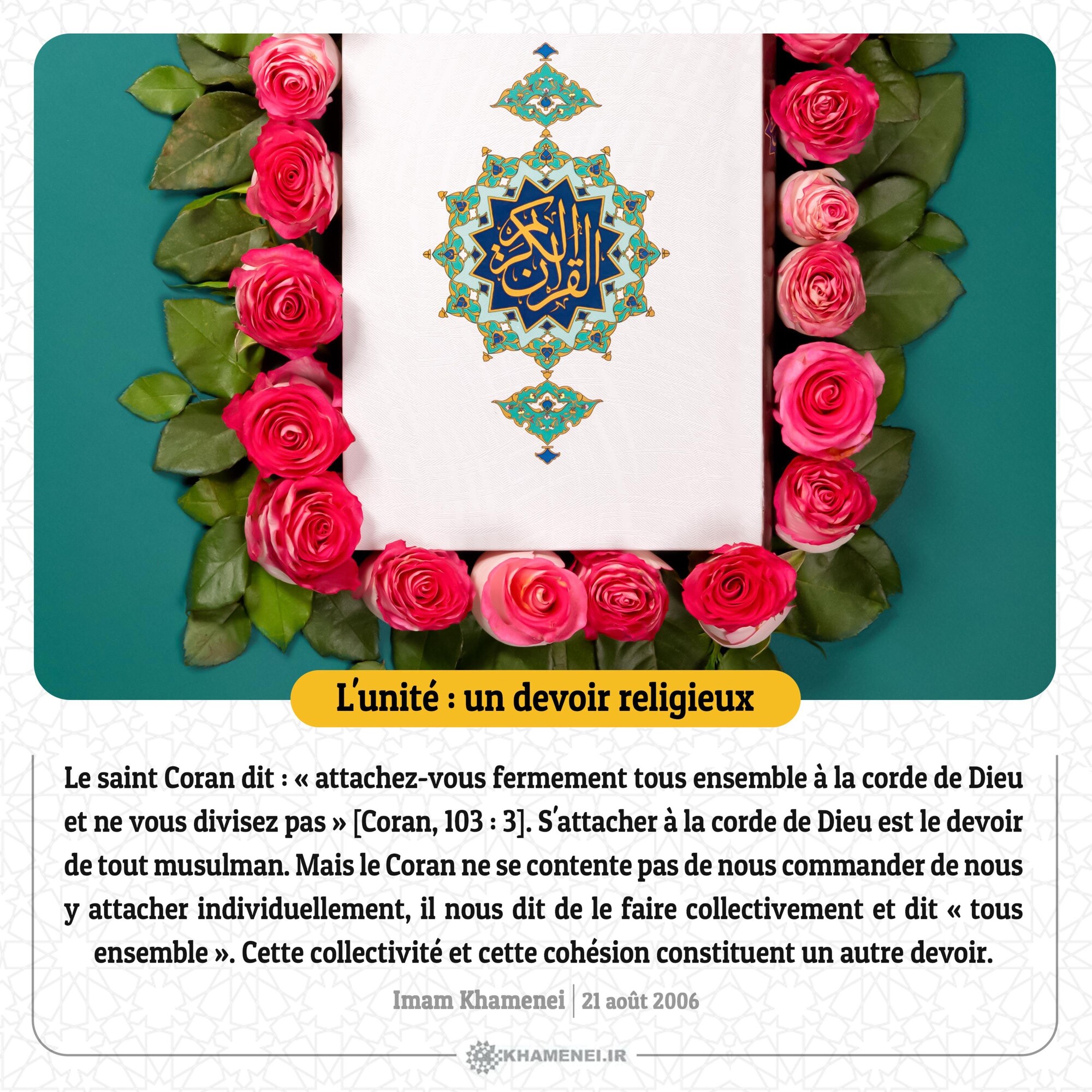 Le saint Coran dit : « attachez-vous fermement tous ensemble à la corde de Dieu et ne vous divisez pas » [Coran, 3 : 103]. S'attacher à la corde de Dieu est le devoir de tout musulman. Mais le Coran ne se contente pas de nous commander de nous y attacher individuellement, il nous dit de le faire collectivement et dit « tous ensemble ». Cette collectivité et cette cohésion constituent un autre devoir. Imam Khamenei, 21 août 2006
