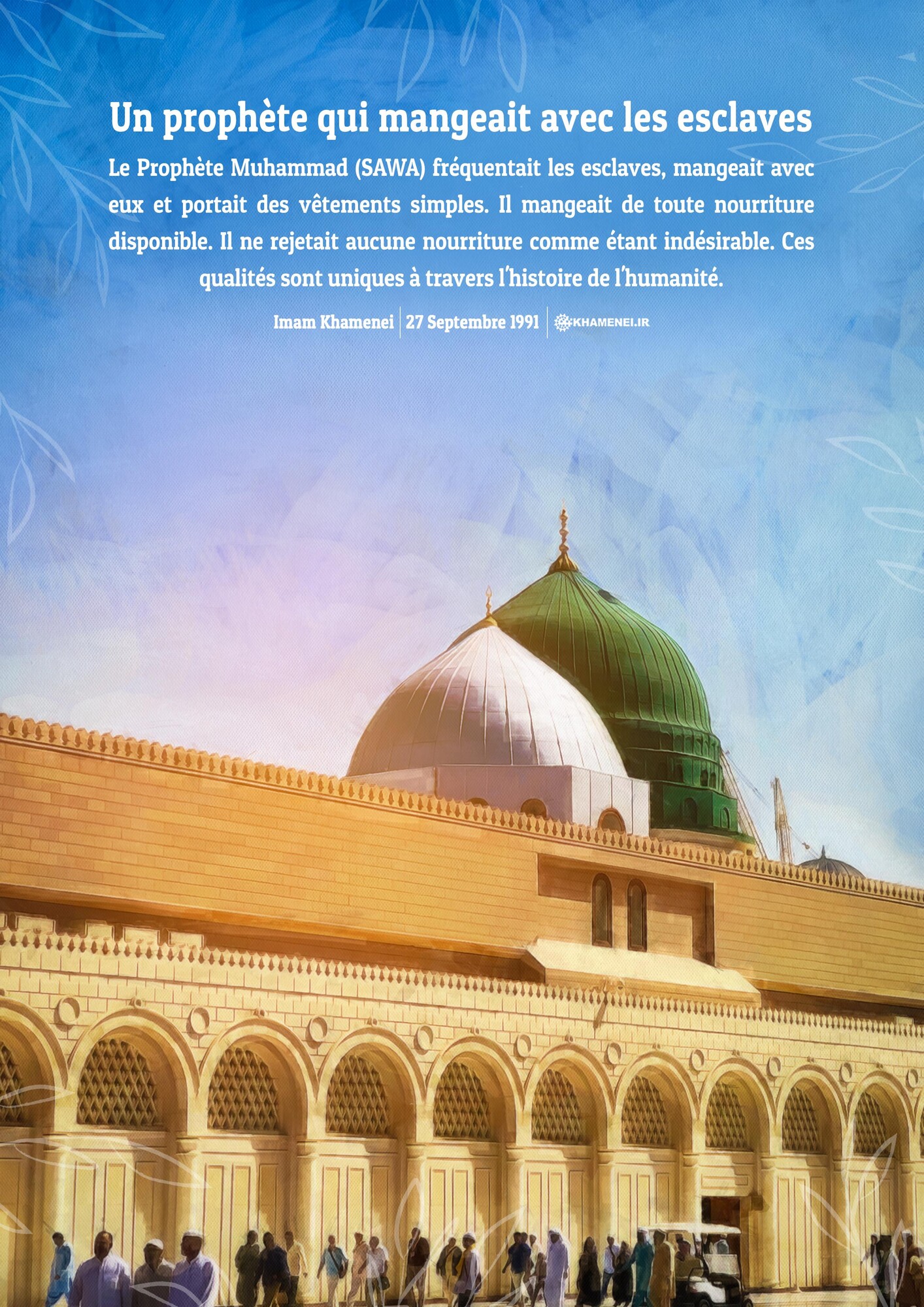 Le Prophète Muhammad (SAWA) fréquentait les esclaves, mangeait avec eux et portait des vêtements simples. Il mangeait de toute nourriture disponible. Il ne rejetait aucune nourriture comme étant indésirable. Ces qualités sont uniques à travers l'histoire de l'humanité. Imam Khamenei, 27 Septembre 1991