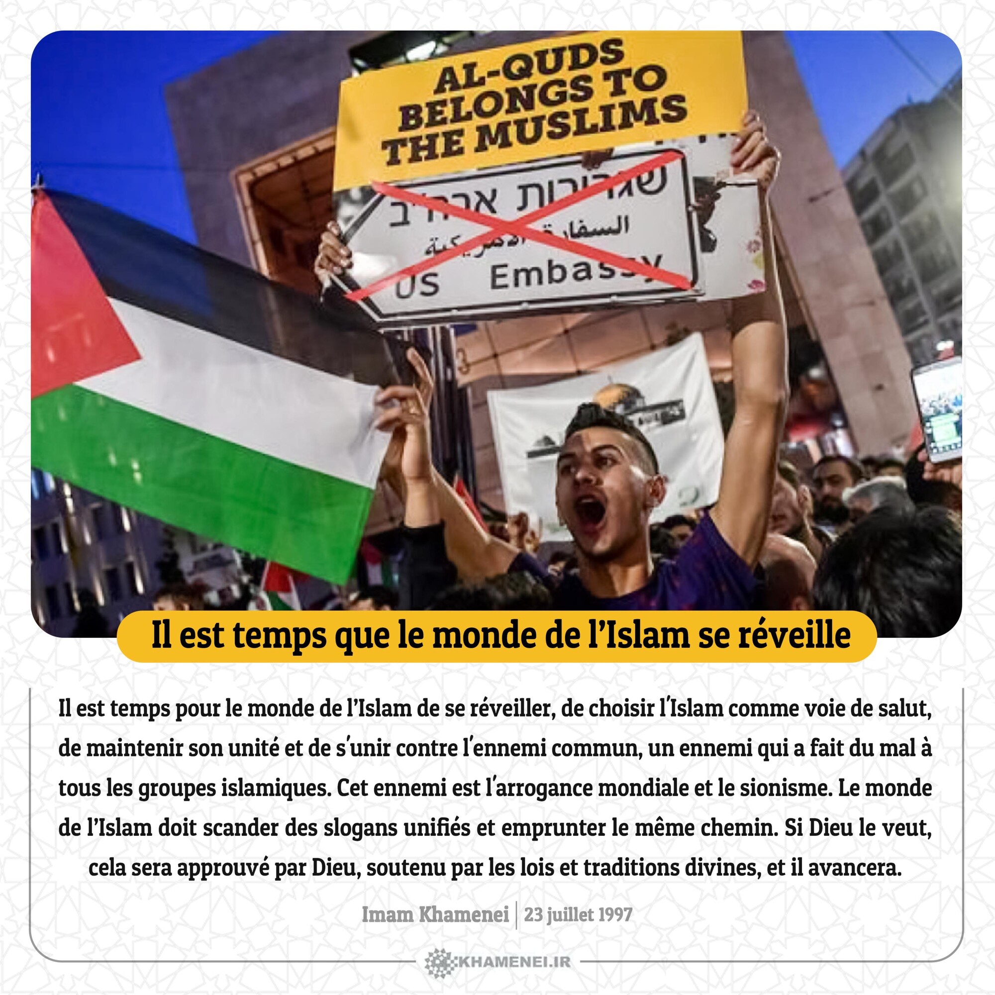Il est temps pour le monde de l’Islam de se réveiller, de choisir l'Islam comme voie de salut, de maintenir son unité et de s'unir contre l'ennemi commun, un ennemi qui a fait du mal à tous les groupes islamiques. Cet ennemi est l'arrogance mondiale et le sionisme. Le monde de l’Islam doit scander des slogans unifiés et emprunter le même chemin. Si Dieu le veut, cela sera approuvé par Dieu, soutenu par les lois et traditions divines, et il avancera. Imam Khamenei, 23 juillet 1997