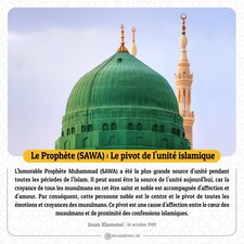 L'honorable Prophète Muhammad (SAWA) a été la plus grande source d'unité pendant toutes les périodes de l'Islam. Il peut aussi être la source de l'unité aujourd'hui, car la croyance de tous les musulmans en cet être saint et noble est accompagnée d'affection et d'amour. Par conséquent, cette personne noble est le centre et le pivot de toutes les émotions et croyances des musulmans. Ce pivot est une cause d'affection entre le cœur des musulmans et de proximité des confessions islamiques. Imam Khamenei, 16 octobre 1989