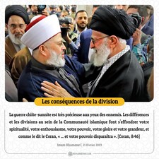 La guerre chiite-sunnite est très précieuse aux yeux des ennemis. Les différences et les divisions au sein de la Communauté islamique font s'effondrer votre spiritualité, votre enthousiasme, votre pouvoir, votre gloire et votre grandeur, et comme le dit le Coran, « ... et votre pouvoir disparaîtra ». [Coran, 8:46] Imam Khamenei, 21 février 2003