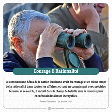 Le commandant-héros de la nation iranienne avait du courage et en même temps de la rationalité dans toutes les affaires, et tout en connaissant avec précision l'ennemi et ses outils, il entrait dans le champ de bataille sans la moindre peur et exécutait des choses incroyables. Imam Khamenei, 1er janvier 2022