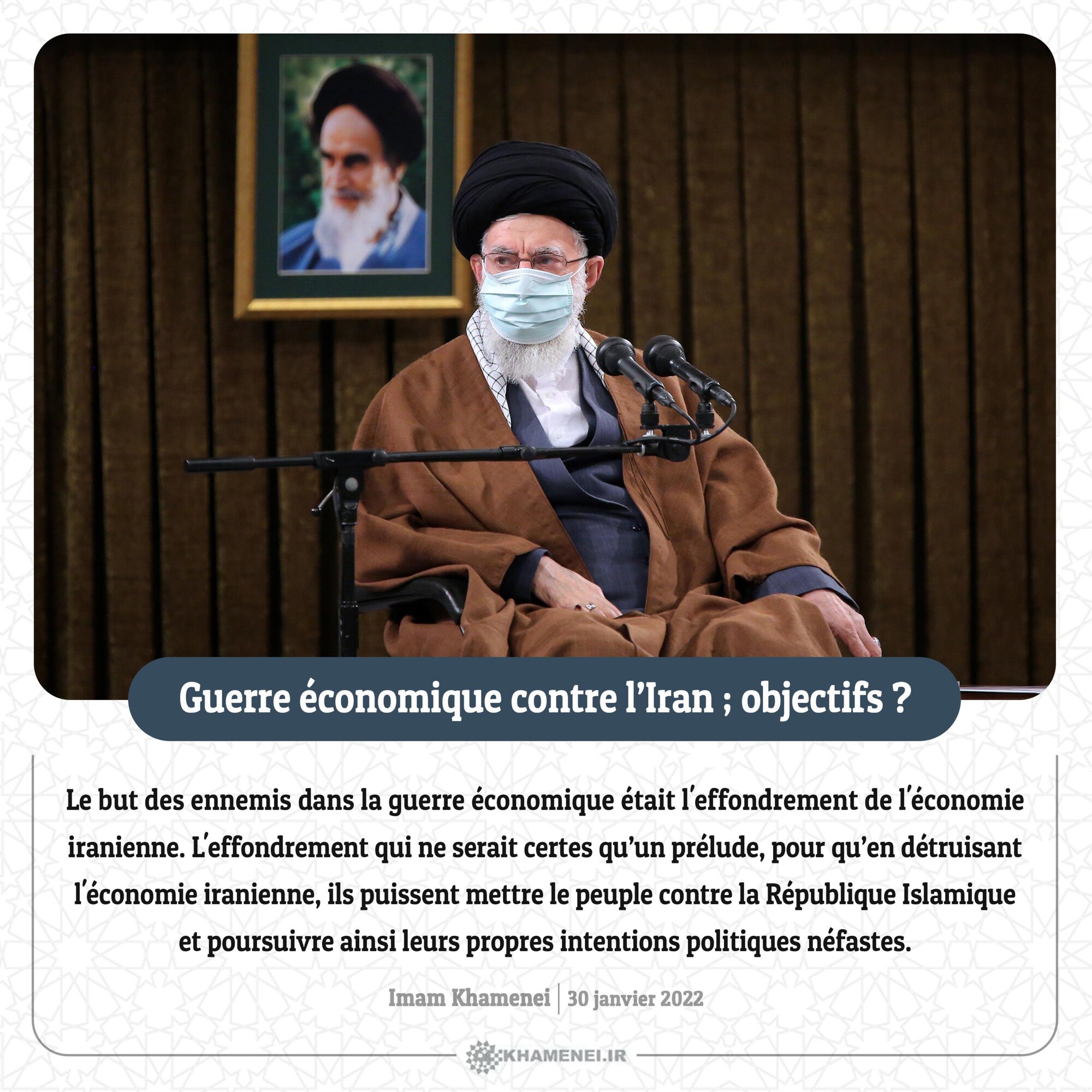 Le but des ennemis dans la guerre économique était l'effondrement de l'économie iranienne. L'effondrement qui ne serait certes qu’un prélude, pour qu’en détruisant l'économie iranienne, ils puissent mettre le peuple contre la République Islamique et poursuivre ainsi leurs propres intentions politiques néfastes. Imam Khamenei, 30 janvier 2022