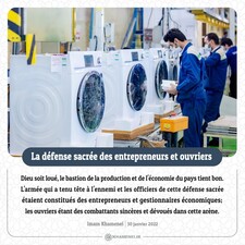 Dieu soit loué, le bastion de la production et de l'économie du pays tient bon. L'armée qui a tenu tête à l'ennemi et les officiers de cette défense sacrée étaient constitués des entrepreneurs et gestionnaires économiques; les ouvriers étant des combattants sincères et dévoués dans cette arène. Imam Khamenei, 30 janvier 2022