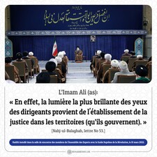 L’Imam Ali (as) : « En effet, la lumière la plus brillante des yeux des dirigeants provient de l'établissement de la justice dans les territoires (qu’ils gouvernent). » [Nahj-ul-Balaghah, lettre No 53.] Hadith installé dans la salle de rencontre des membres de l'Assemblée des Experts avec le Guide Suprême de la Révolution, le 10 mars 2022