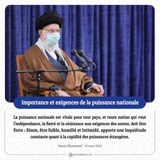 La puissance nationale est vitale pour tout pays, et toute nation qui veut l'indépendance, la fierté et la résistance aux exigences des autres, doit être forte ; Sinon, être faible, humilié et intimidé, apporte une inquiétude constante quant à la cupidité des puissances étrangères. Imam Khamenei, 10 mars 2022