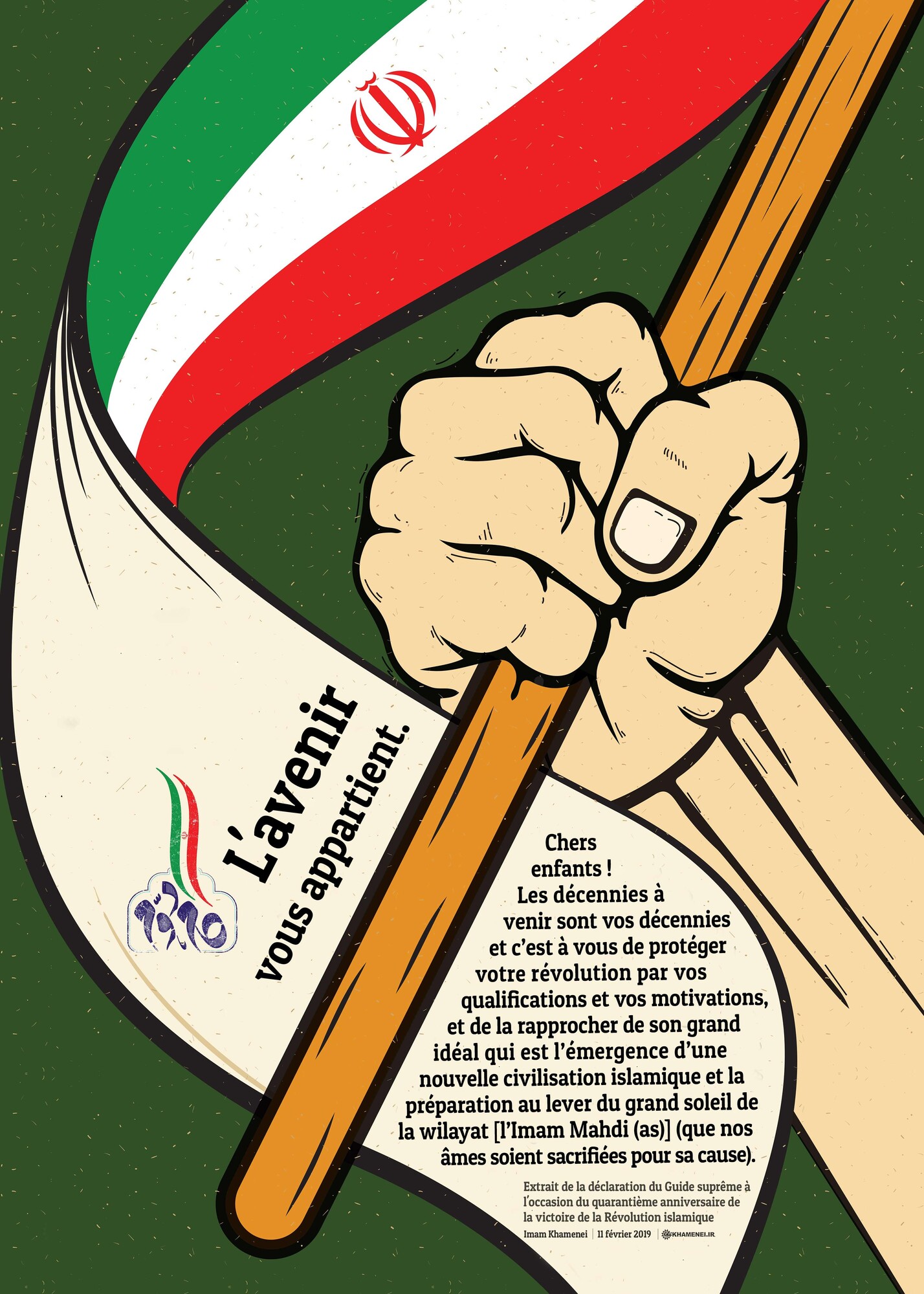 Chers enfants ! Les décennies à venir sont vos décennies et c’est à vous de protéger votre révolution par vos qualifications et vos motivations, et de la rapprocher de son grand idéal qui est l’émergence d’une nouvelle civilisation islamique et la préparation au lever du grand soleil de la wilayat [l’Imam Mahdi (as)] (que nos âmes soient sacrifiées pour sa cause). (Extrait de la déclaration du Guide suprême à l'occasion du quarantième anniversaire de la victoire de la Révolution islamique, 11 février 2019)
