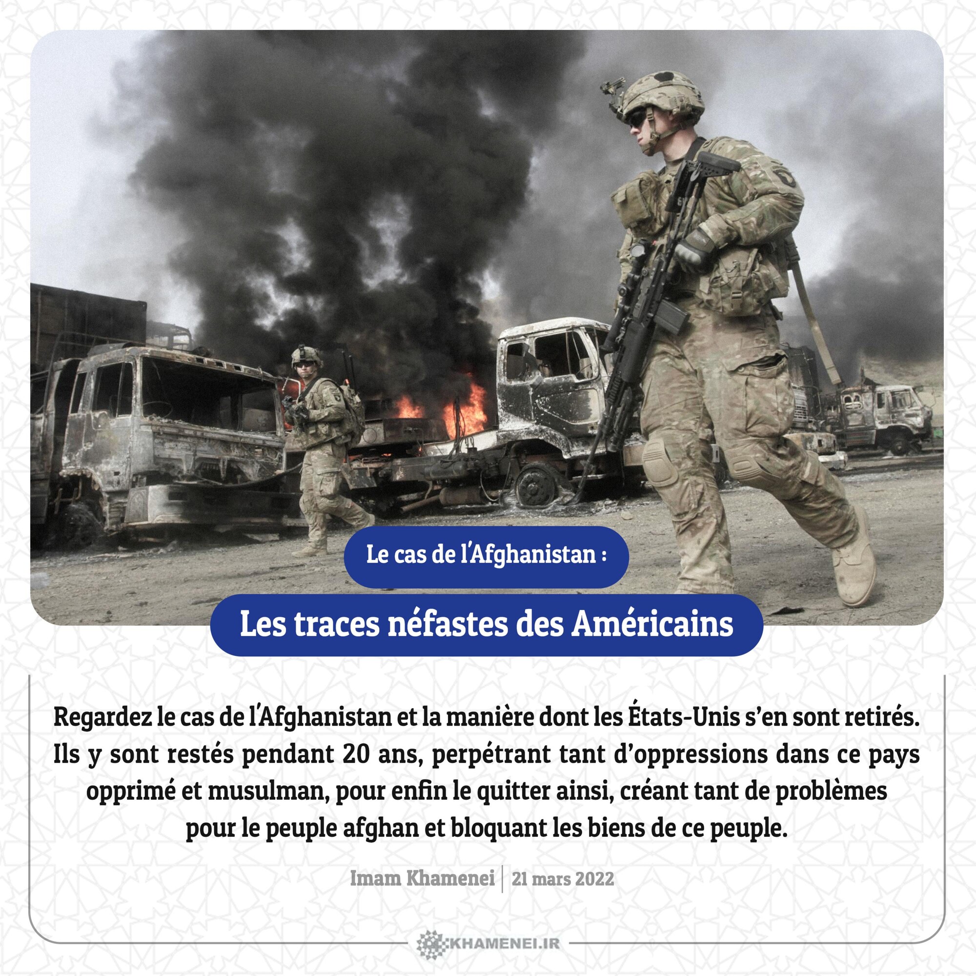 Regardez le cas de l'Afghanistan et la manière dont les États-Unis s’en sont retirés. Ils y sont restés pendant 20 ans, perpétrant tant d’oppressions dans ce pays opprimé et musulman, pour enfin le quitter ainsi, créant tant de problèmes pour le peuple afghan et bloquant les biens de ce peuple. Imam Khamenei, 21 mars 2022