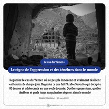 Regardez le cas du Yémen où ce peuple innocent et vraiment résilient est bombardé chaque jour. Regardez ce que fait l’Arabie Saoudite qui décapite 80 jeunes et adolescents en une seule journée. Quelles oppressions, quelles ténèbres et quels loups sanguinaires règnent dans le monde! Imam Khamenei, 21 mars 2022