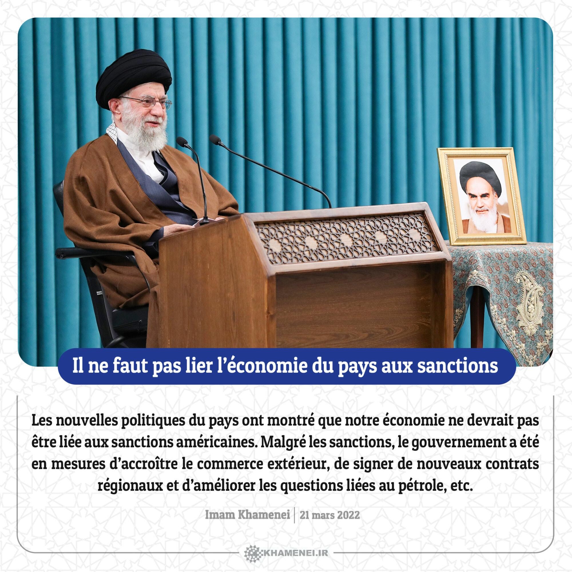 Les nouvelles politiques du pays ont montré que notre économie ne devrait pas être liée aux sanctions américaines. Malgré les sanctions, le gouvernement a été en mesures d’accroître le commerce extérieur, de signer de nouveaux contrats régionaux et d’améliorer les questions liées au pétrole, etc. Imam Khamenei, 21 mars 2022