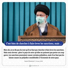 Bien sûr, je ne dis pas du tout qu'il ne faut pas chercher à faire lever les sanctions. Mais nous devons  gérer le pays de sorte qu’elles ne puissent pas porter un coup grave. Les sanctions pourraient causer certains préjudices, mais il ne faut pas les laisser causer un préjudice considérable à l’économie de notre pays. Imam Khamenei, 21 mars 2022