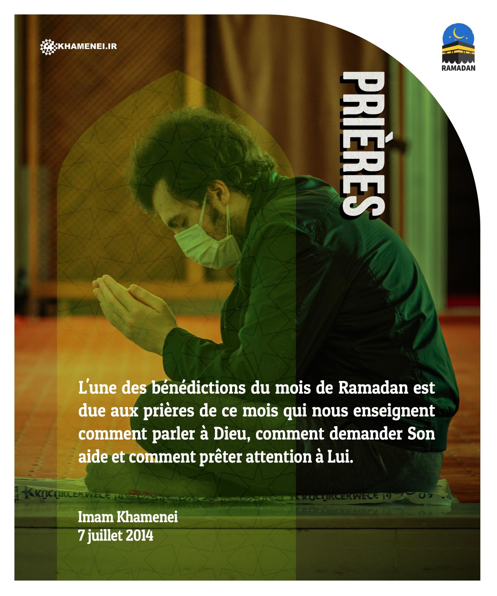 L'une des bénédictions du mois de Ramadan est due aux prières de ce mois qui nous enseignent comment parler à Dieu, comment demander Son aide et comment prêter attention à Lui. Imam Khamenei, 7 juillet 2014