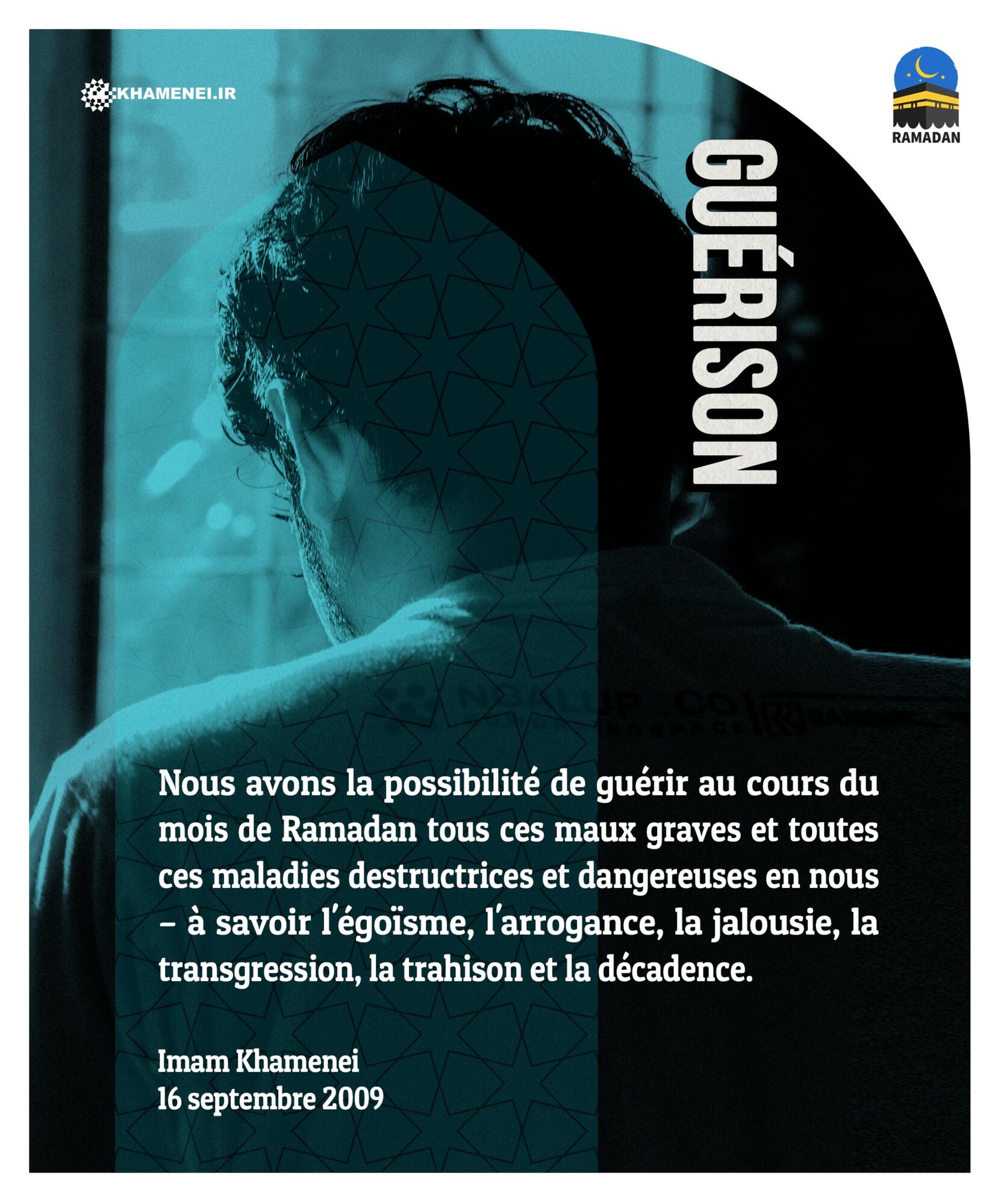 Nous avons la possibilité de guérir au cours du mois de Ramadan tous ces maux graves et toutes ces maladies destructrices et dangereuses en nous – à savoir l'égoïsme, l'arrogance, la jalousie, la transgression, la trahison et la décadence. Imam Khamenei, 16 septembre 2009