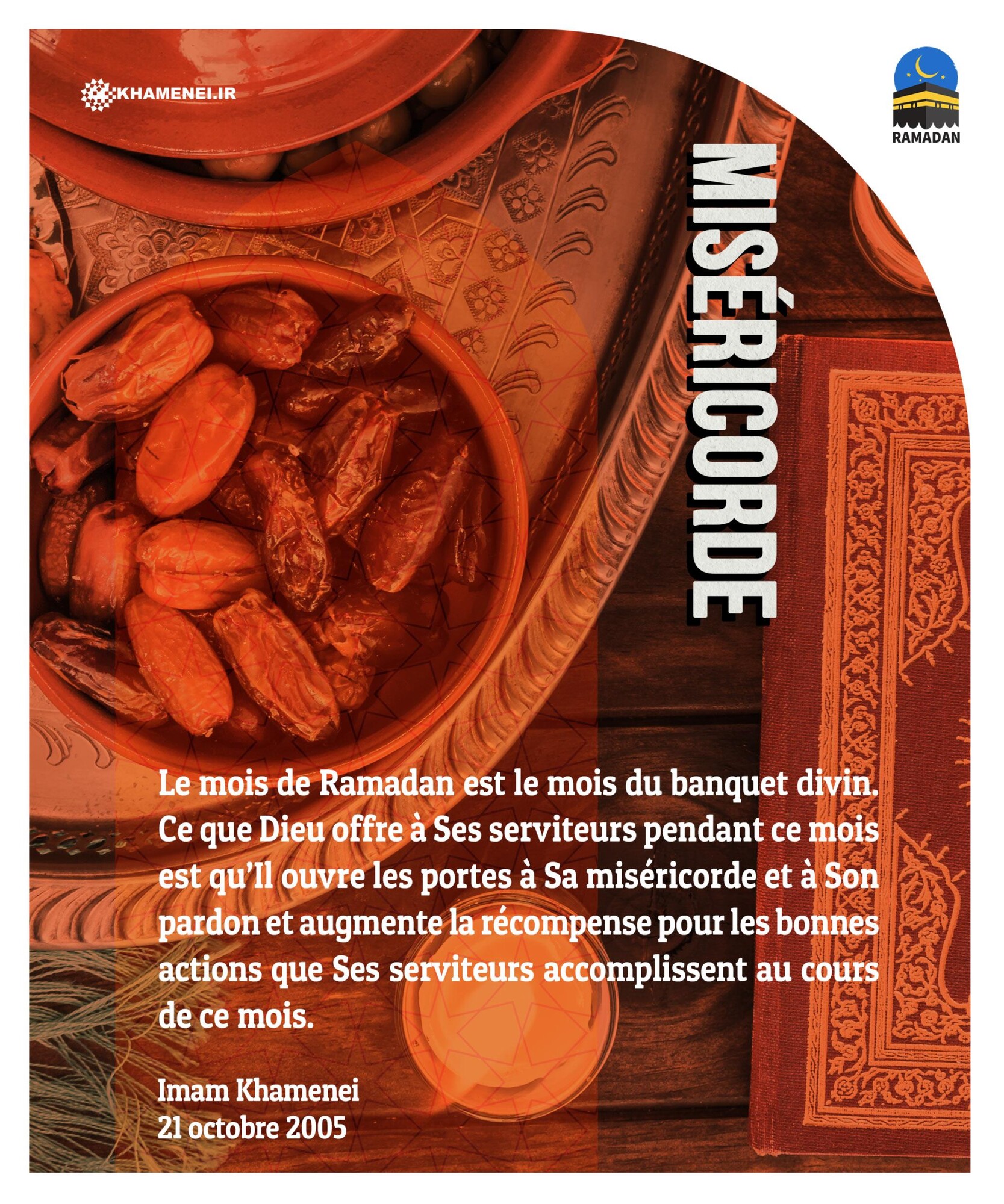 Le mois de Ramadan est le mois du banquet divin. Ce que Dieu offre à Ses serviteurs pendant ce mois est qu’Il ouvre les portes à Sa miséricorde et à Son pardon et augmente la récompense pour les bonnes actions que Ses serviteurs accomplissent au cours de ce mois. Imam Khamenei, 21 octobre 2005