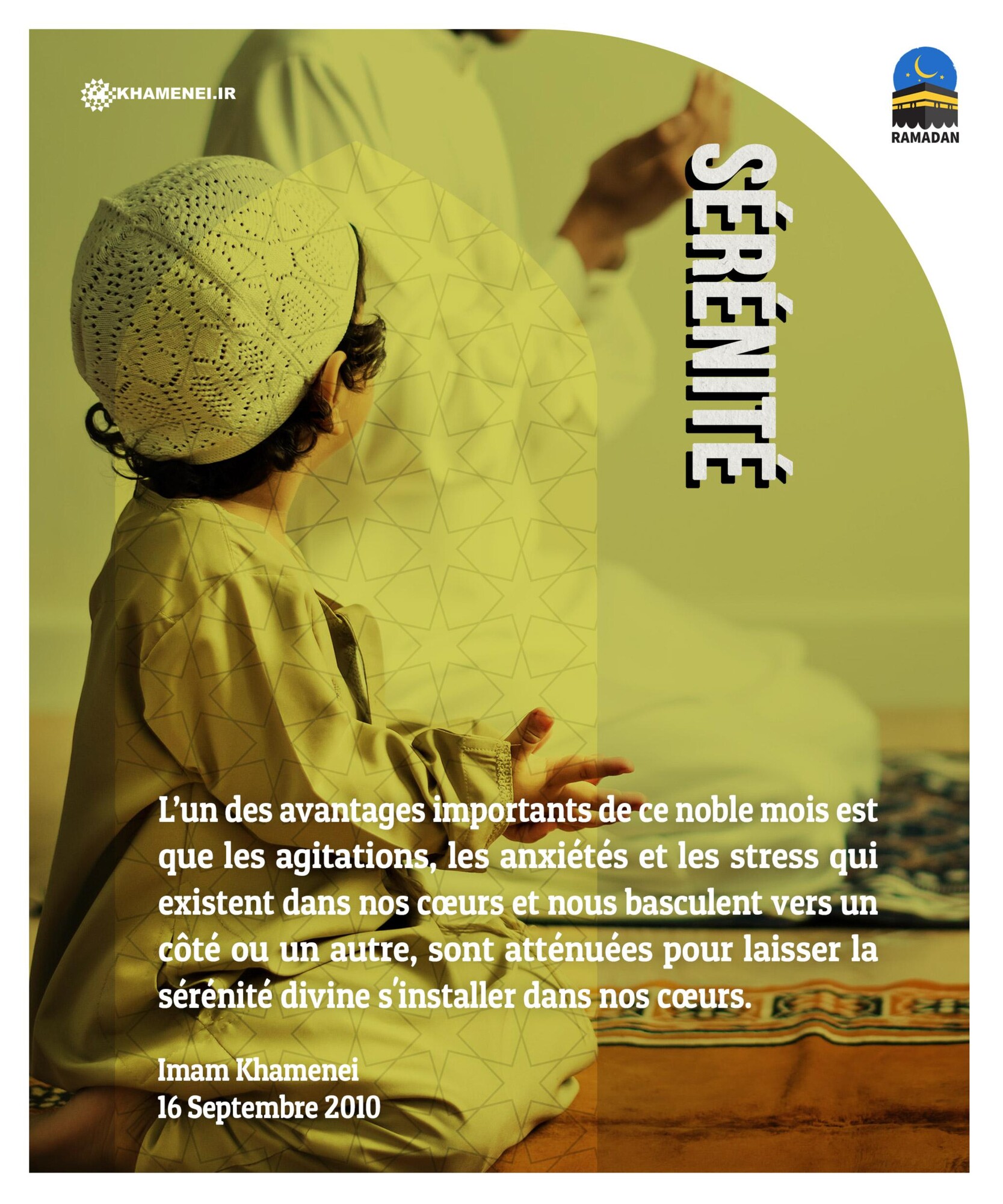 L’un des avantages importants de ce noble mois est que les agitations, les anxiétés et les stress qui existent dans nos cœurs et nous basculent vers un côté ou un autre, sont atténuées pour laisser la sérénité divine s'installer dans nos cœurs. Imam Khamenei, 16 Septembre 2010