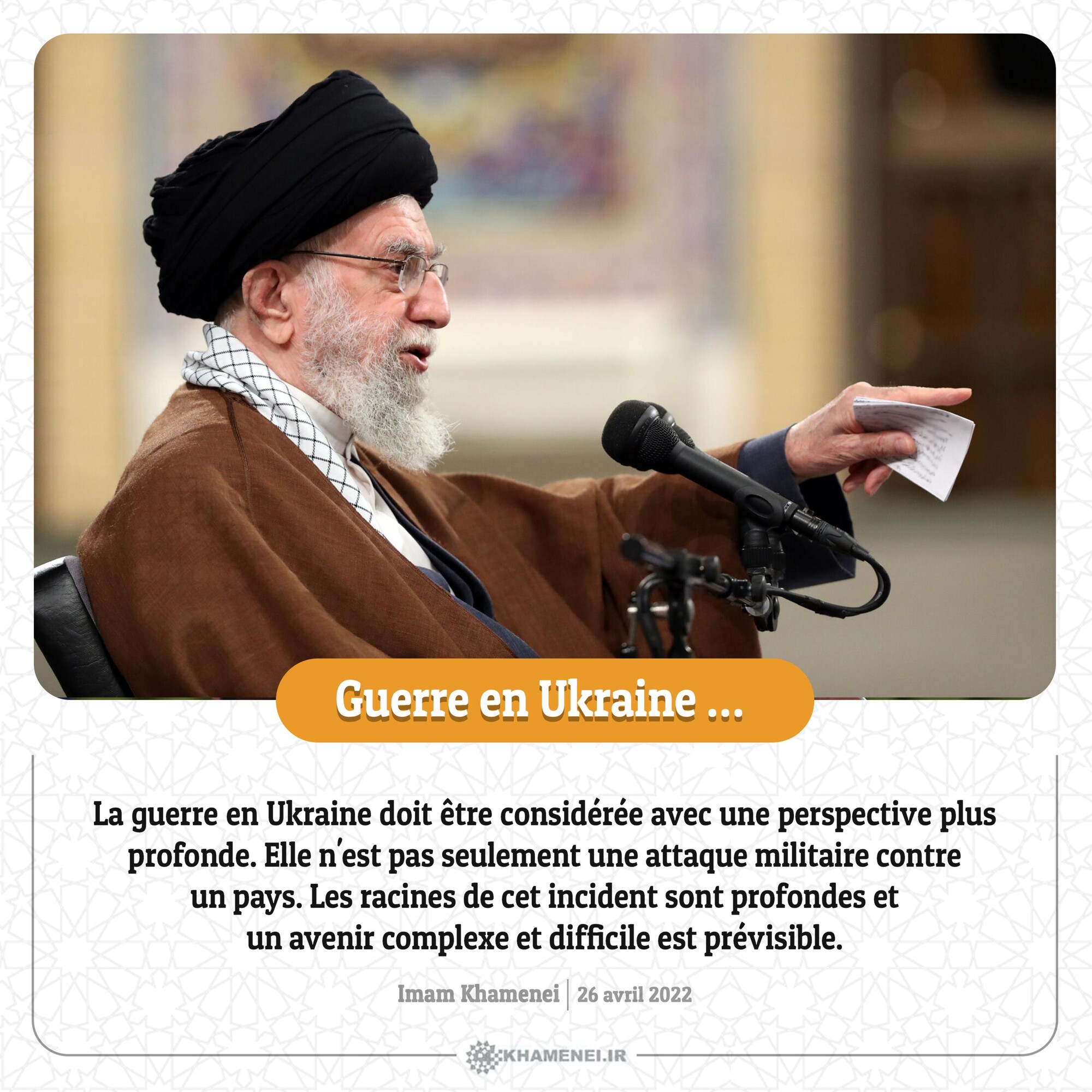 La guerre en Ukraine doit être considérée avec une perspective plus profonde. Elle n'est pas seulement une attaque militaire contre un pays. Les racines de cet incident sont profondes et un avenir complexe et difficile est prévisible. Imam Khamenei, 26 avril 2022