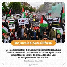 Les Palestiniens ont fait de grands sacrifices pendant le Ramadan de l'année dernière et aussi celui de l’année en cours. Le régime sioniste commet toujours les pires des crimes, et les États-Unis et l'Europe continuent à les soutenir. Imam Khamenei, 26 avril 2022