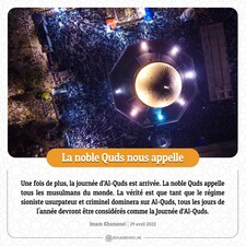 Une fois de plus, la journée d’Al-Quds est arrivée. La noble Quds appelle tous les musulmans du monde. La vérité est que tant que le régime sioniste usurpateur et criminel dominera sur Al-Quds, tous les jours de l'année devront être considérés comme la Journée d’Al-Quds. Imam Khamenei, 29 avril 2022