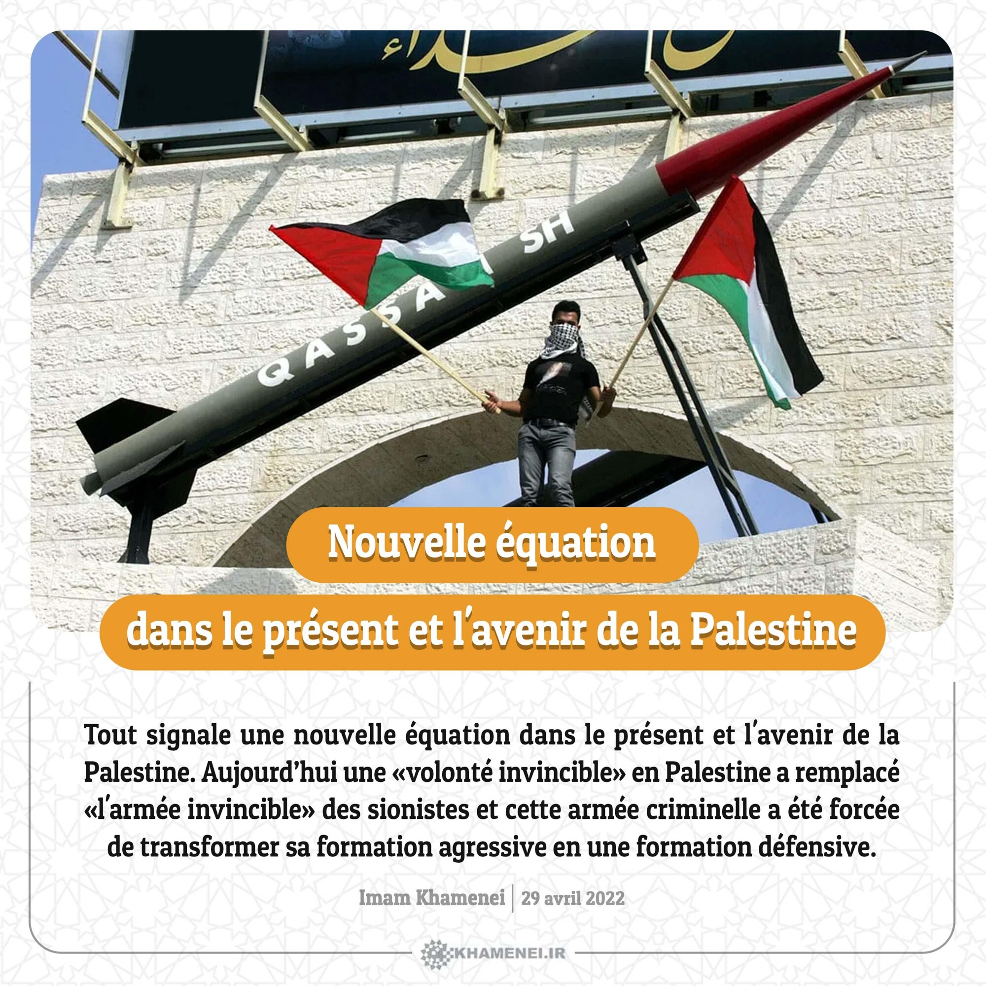 Tout signale une nouvelle équation dans le présent et l'avenir de la Palestine. Aujourd’hui une «volonté invincible» en Palestine a remplacé «l'armée invincible» des sionistes et cette armée criminelle a été forcée de transformer sa formation agressive en une formation défensive. Imam Khamenei, 29 avril 2022