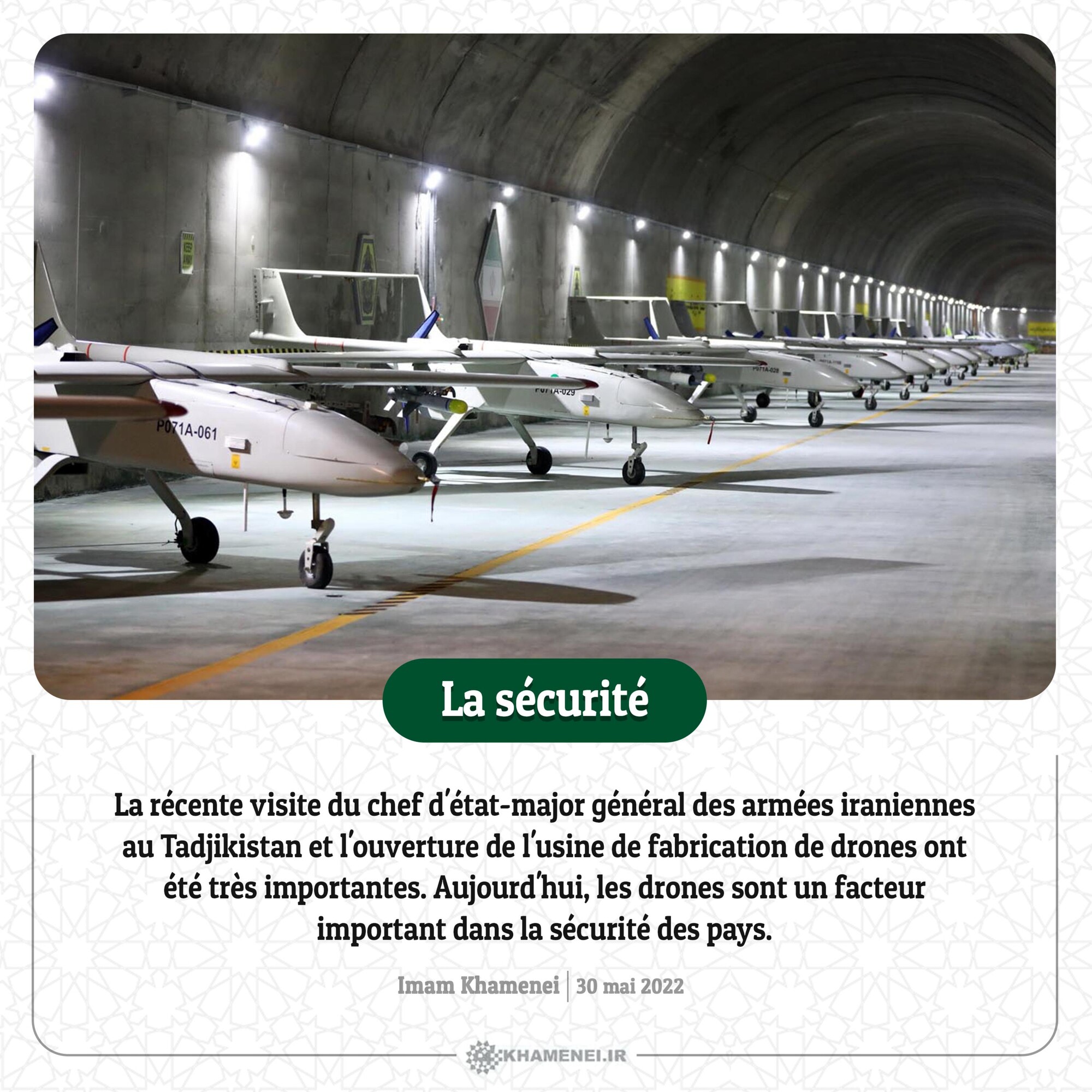 La récente visite du chef d'état-major général des armées iraniennes au Tadjikistan et l'ouverture de l'usine de fabrication de drones ont été très importantes. Aujourd'hui, les drones sont un facteur important dans la sécurité des pays. Imam Khamenei, 30 mai 2022