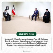 Les capacités d'élargir les coopérations entre l'Iran et le Tadjikistan dans divers domaines dépasse largement le niveau actuel et doit connaître une évolution essentielle. L'Iran et le Tadjikistan sont deux pays frères, interconnectés comme par un lien de parenté. Imam Khamenei, 30 mai 2022