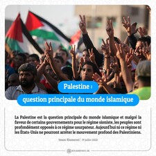 La Palestine est la question principale du monde islamique et malgré la faveur de certains gouvernements pour le régime sioniste, les peuples sont profondément opposés à ce régime usurpateur. Aujourd'hui ni ce régime ni les États-Unis ne pourront arrêter le mouvement profond des Palestiniens. Imam Khamenei, 19 juillet 2022