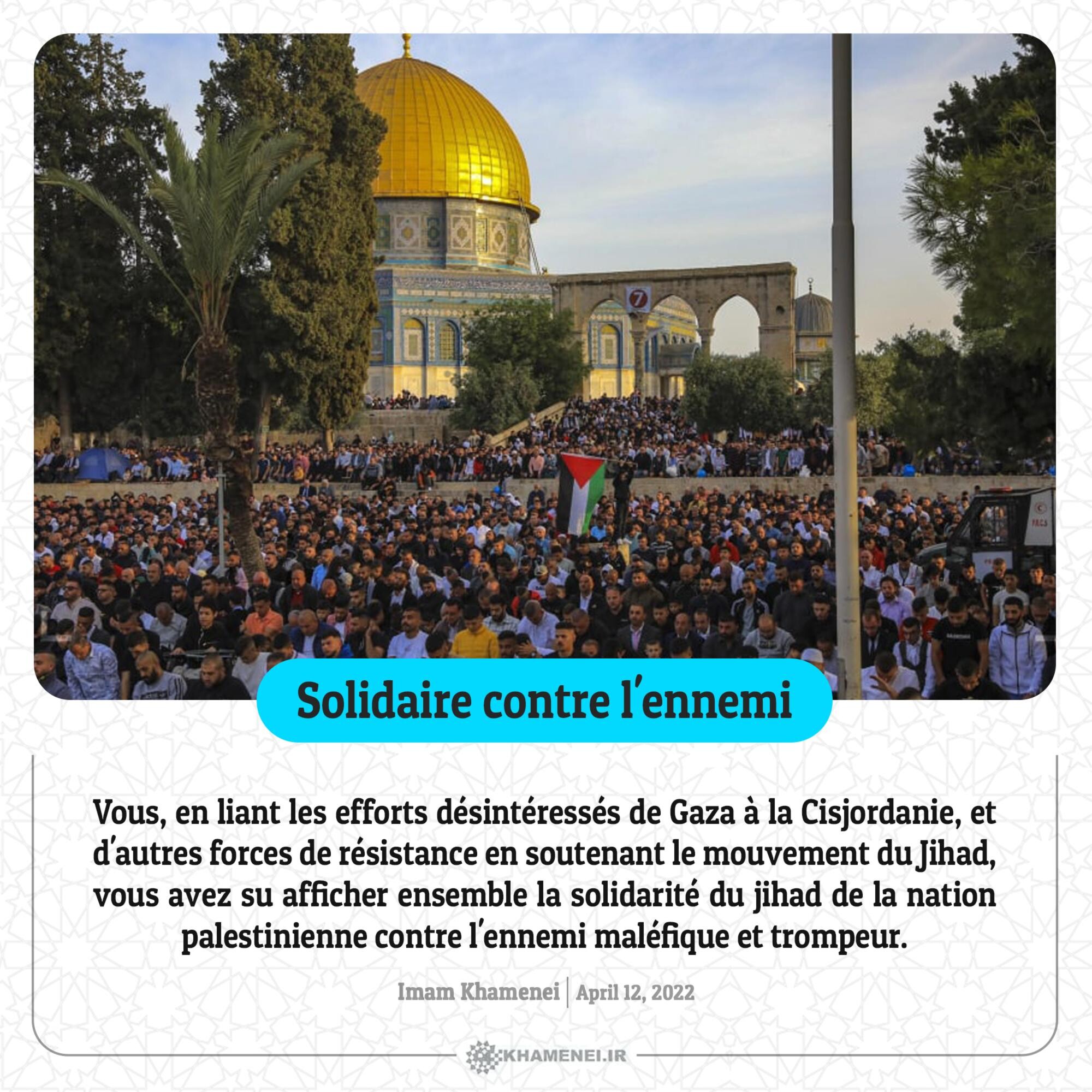 Vous, en liant les efforts désintéressés de Gaza à la Cisjordanie, et d'autres forces de résistance en soutenant le mouvement du Jihad, vous avez su afficher ensemble la solidarité du jihad de la nation palestinienne contre l'ennemi maléfique et trompeur. Imam Khamenei, 11 août 2022