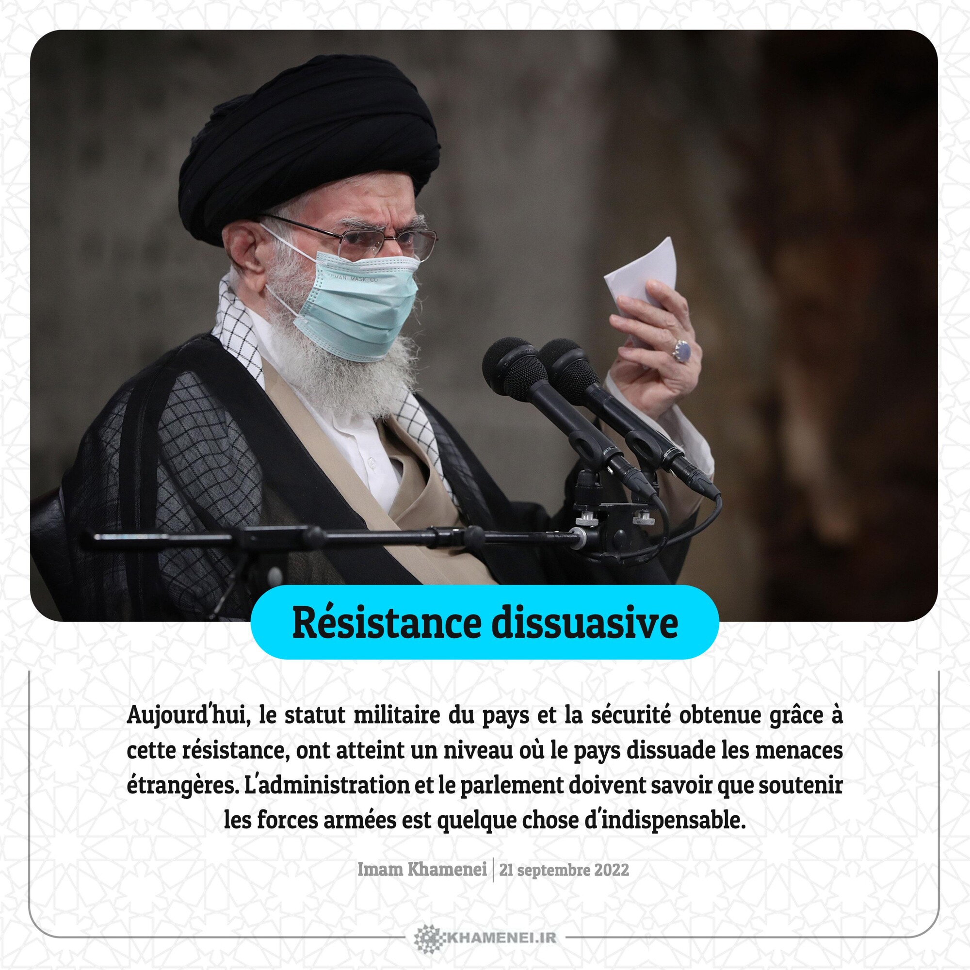 Aujourd'hui, le statut militaire du pays et la sécurité obtenue grâce à cette résistance, ont atteint un niveau où le pays dissuade les menaces étrangères. L'administration et le parlement doivent savoir que soutenir les forces armées est quelque chose d'indispensable. Imam Khamenei, 21 septembre 2022