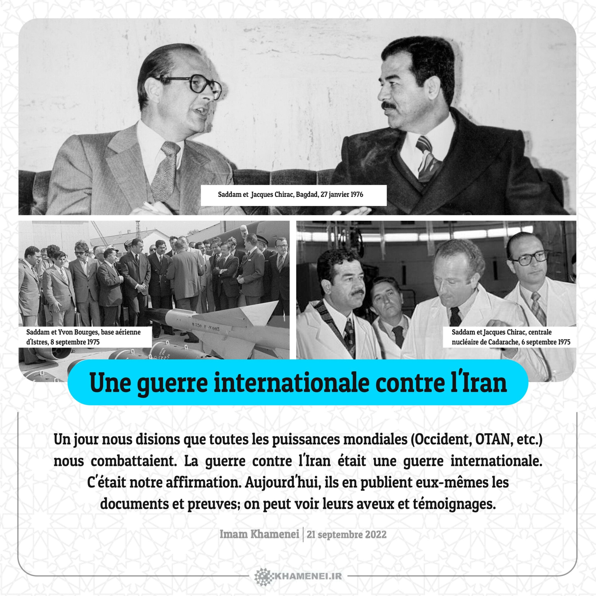 Un jour nous disions que toutes les puissances mondiales (Occident, OTAN, etc.) nous combattaient. La guerre contre l'Iran était une guerre internationale. C'était notre affirmation. Aujourd'hui, ils en publient eux-mêmes les documents et preuves; on peut voir leurs aveux et témoignages. Imam Khamenei, 21 septembre 2022
