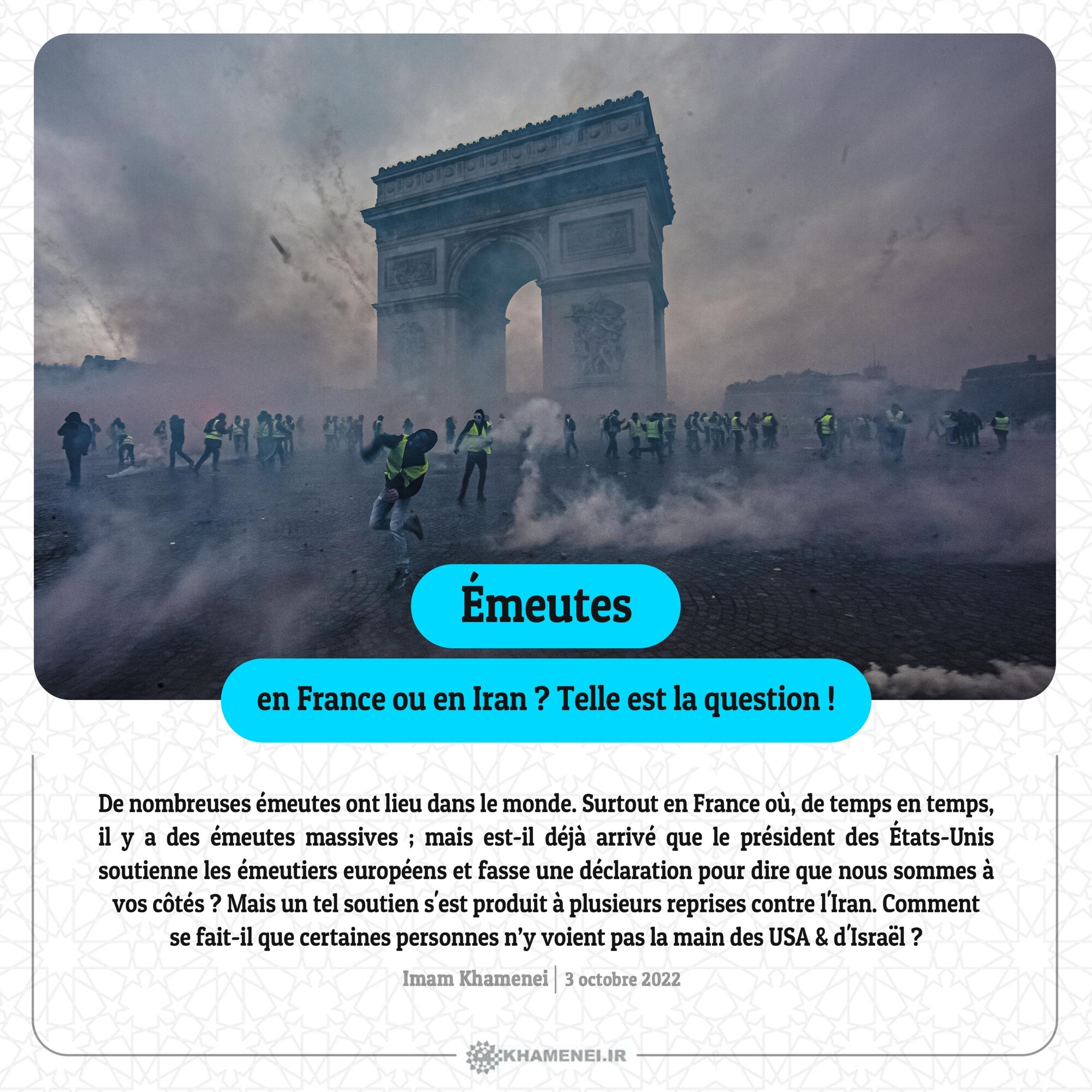 De nombreuses émeutes ont lieu dans le monde. Surtout en France où, de temps en temps, il y a des émeutes massives ; mais est-il déjà arrivé que le président des États-Unis soutienne les émeutiers européens et fasse une déclaration pour dire que nous sommes à vos côtés ? Mais un tel soutien s'est produit à plusieurs reprises contre l'Iran. Comment se fait-il que certaines personnes n’y voient pas la main des USA & d'Israël ? Imam Khamenei, 3 octobre 2022