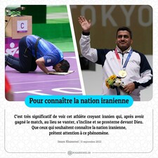 C’est très significatif de voir cet athlète croyant iranien qui, après avoir gagné le match, au lieu se vanter, s’incline et se prosterne devant Dieu. Que ceux qui souhaitent connaître la nation iranienne, prêtent attention à ce phénomène. Imam Khamenei, 11 septembre 2022