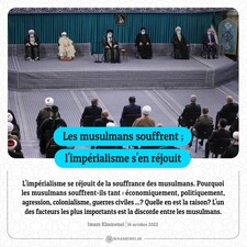 L'impérialisme se réjouit de la souffrance des musulmans. Pourquoi les musulmans souffrent-ils tant : économiquement, politiquement, agression, colonialisme, guerres civiles ...?Quelle en est la raison? L'un des facteurs les plus importants est la discorde entre les musulmans. Imam Khamenei, 14 octobre 2022