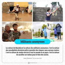 La culture du Bassidj est la culture des militants anonymes; c’est la culture des moudjahids altruistes prêts à prendre des risques, sans aucune crainte; c’est la culture de rendre service à tout le monde & au pays; c'est la culture de sacrifier soi-même pour le bien des autres. Imam Khamenei, 26 novembre 2022