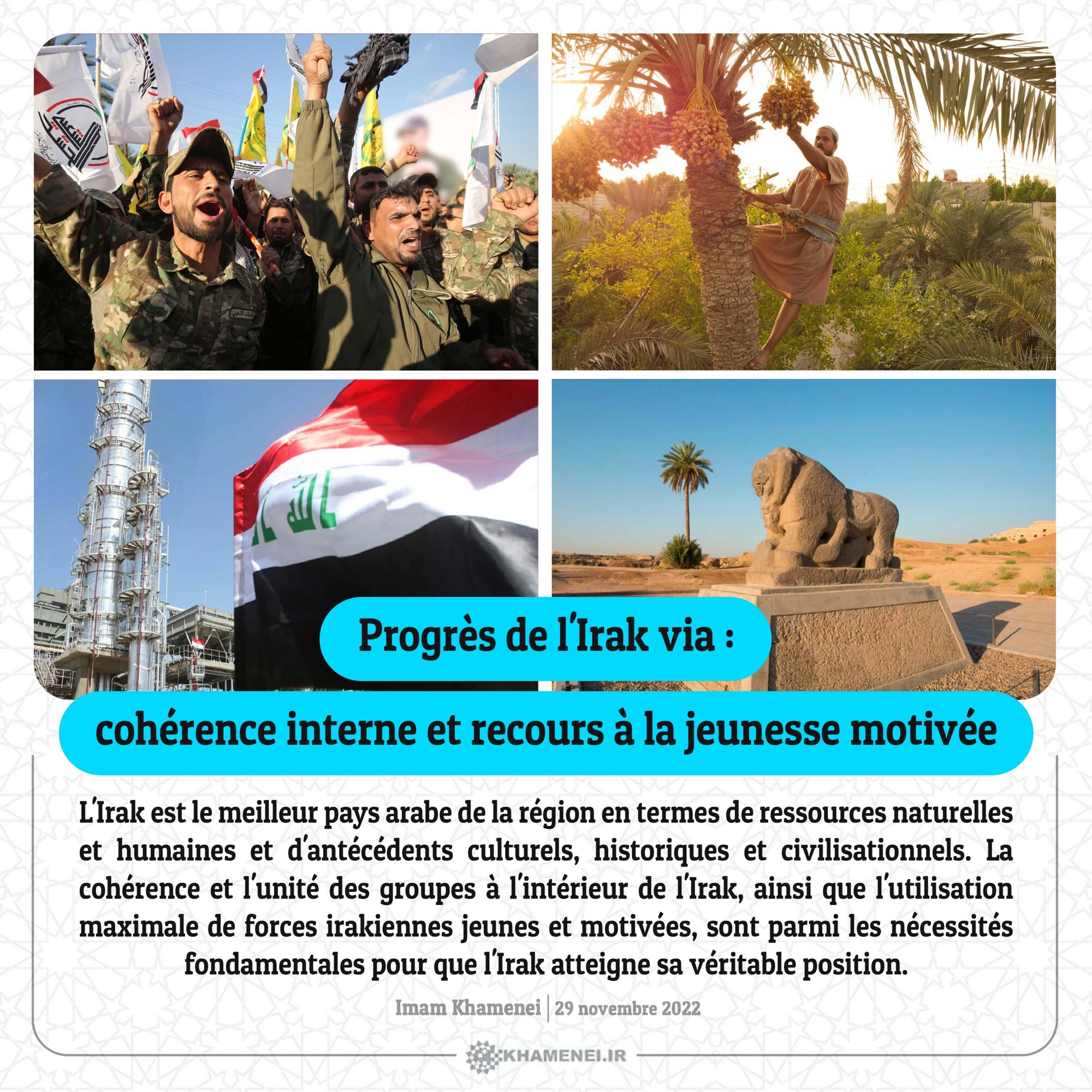 L'Irak est le meilleur pays arabe de la région en termes de ressources naturelles et humaines et d'antécédents culturels, historiques et civilisationnels. La cohérence et l'unité des groupes à l'intérieur de l'Irak, ainsi que l'utilisation maximale de forces irakiennes jeunes et motivées, sont parmi les nécessités fondamentales pour que l'Irak atteigne sa véritable position.