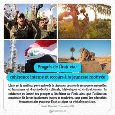 L'Irak est le meilleur pays arabe de la région en termes de ressources naturelles et humaines et d'antécédents culturels, historiques et civilisationnels. La cohérence et l'unité des groupes à l'intérieur de l'Irak, ainsi que l'utilisation maximale de forces irakiennes jeunes et motivées, sont parmi les nécessités fondamentales pour que l'Irak atteigne sa véritable position.