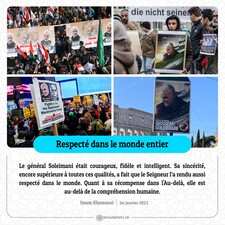 Le général Soleimani était courageux, fidèle et intelligent. Sa sincérité, encore supérieure à toutes ces qualités, a fait que le Seigneur l’a rendu aussi respecté dans le monde. Quant à sa récompense dans l'Au-delà, elle est au-delà de la compréhension humaine. Imam Khamenei, 1er janvier 2023