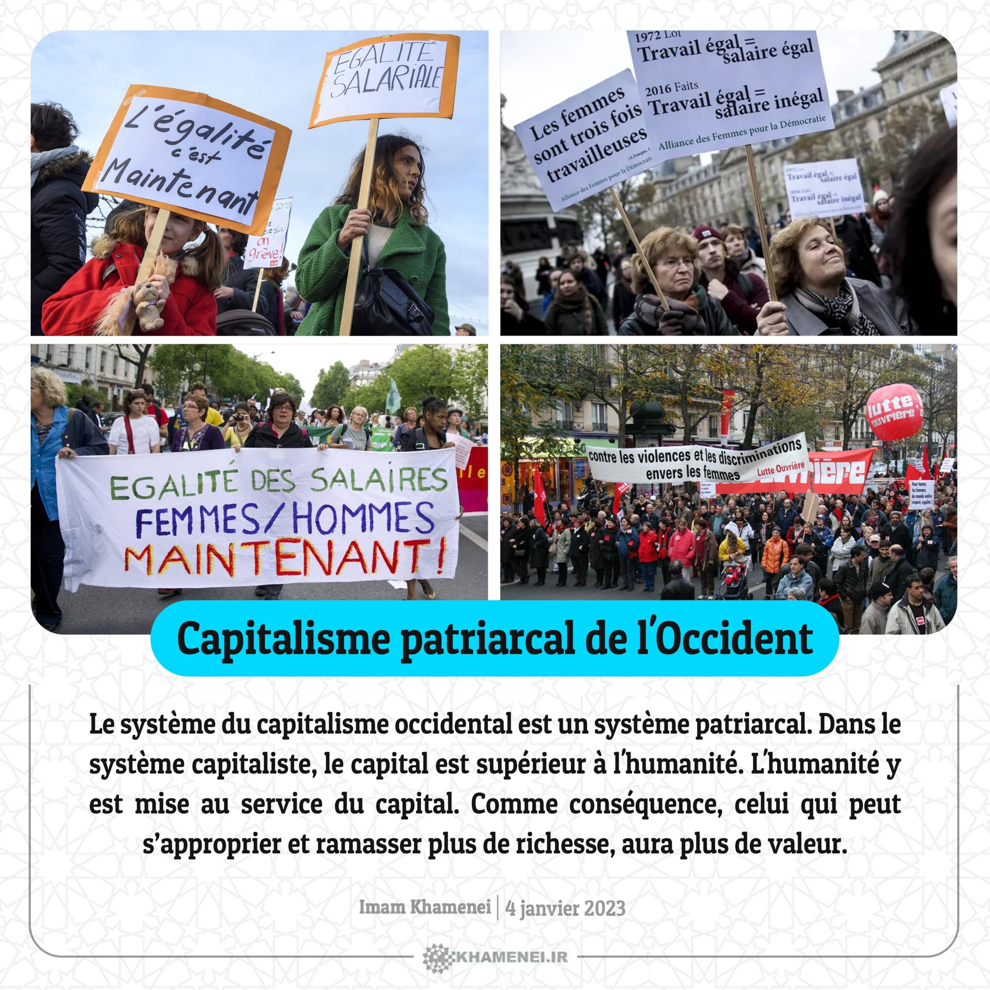 Le système du capitalisme occidental est un système patriarcal. Dans le système capitaliste, le capital est supérieur à l'humanité. L'humanité y est mise au service du capital. Comme conséquence, celui qui peut s’approprier et ramasser plus de richesse, aura plus de valeur. Imam Khamenei, 4 janvier 2023