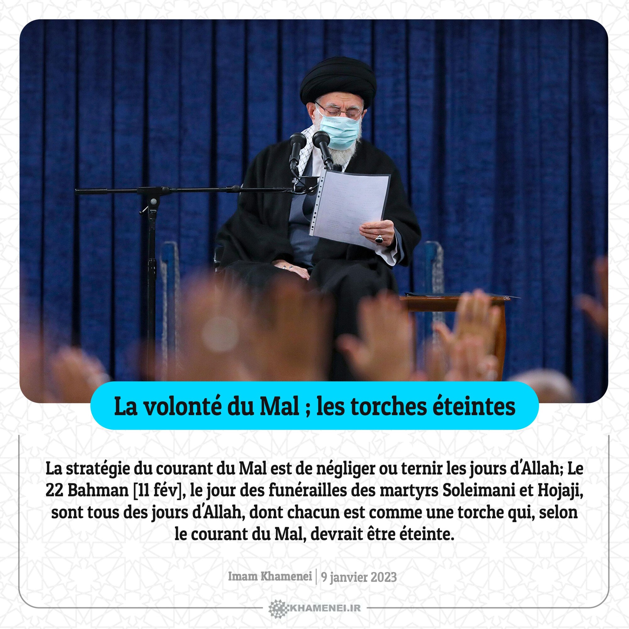La stratégie du courant du Mal est de négliger ou ternir les jours d'Allah; Le 22 Bahman [11 fév], le jour des funérailles des martyrs Soleimani et Hojaji, sont tous des jours d'Allah, dont chacun est comme une torche qui, selon le courant du Mal, devrait être éteinte. Imam Khamenei, 9 janvier 2023