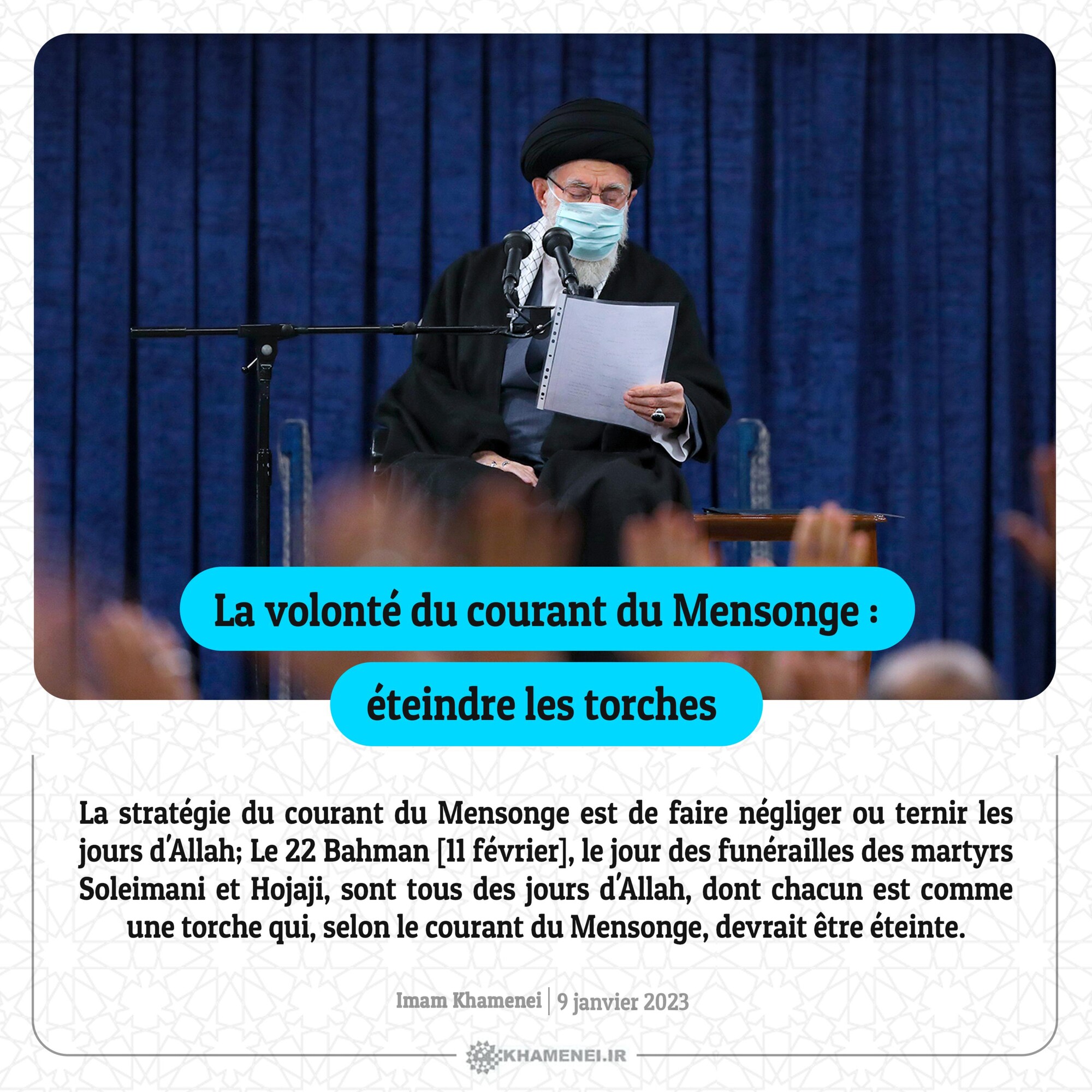 La stratégie du courant du Mensonge est de faire négliger ou ternir les jours d'Allah; Le 22 Bahman [11 février], le jour des funérailles des martyrs Soleimani et Hojaji, sont tous des jours d'Allah, dont chacun est comme une torche qui, selon le courant du Mensonge, devrait être éteinte. Imam Khamenei, 9 janvier 2023