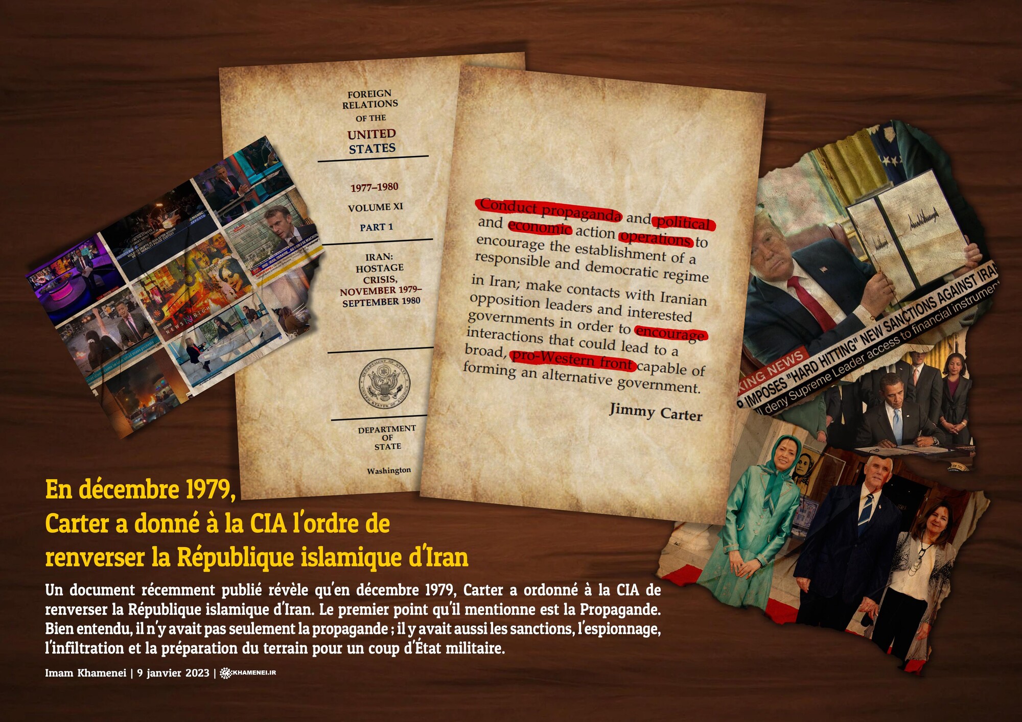 Un document récemment publié révèle qu'en décembre 1979, Carter a ordonné à la CIA de renverser la République islamique d'Iran. Le premier point qu'il mentionne est la Propagande. Bien entendu, il n'y avait pas seulement la propagande ; il y avait aussi les sanctions, l'espionnage, l'infiltration et la préparation du terrain pour un coup d'État militaire. Imam Khamenei, 9 janvier 2023