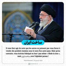 Il vous faut agir de sorte que les autres ne puissent pas vous forcer à vendre des produits iraniens sous le nom d'un autre pays. Mais qu’au contraire, vous écriviez Fabriqué en Iran ! pas même « Made in Iran », mais ساخت ایران, avec l’alphabet persan ! Imam Khamenei, 30 janvier 2023