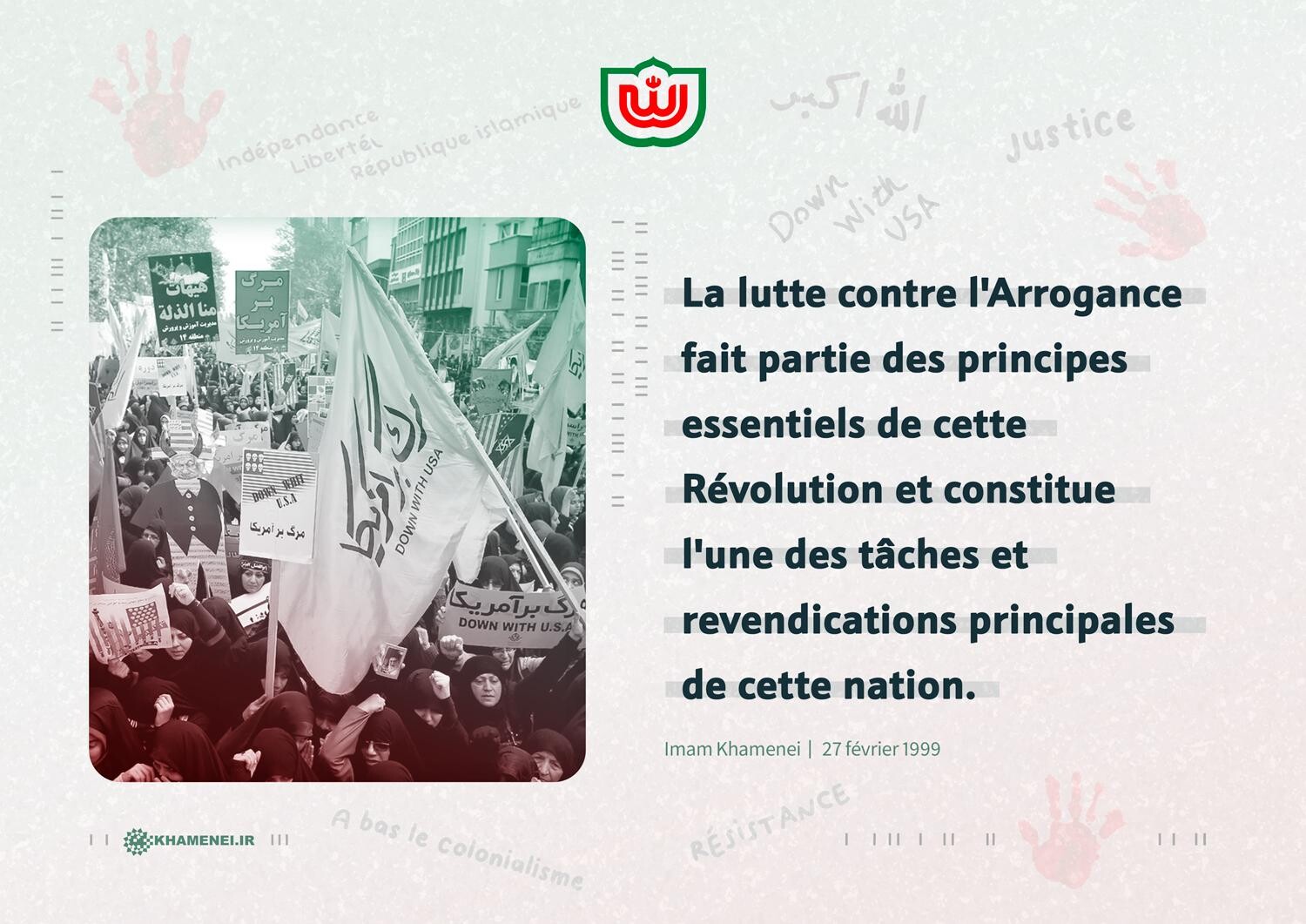 La lutte contre l'Arrogance fait partie des principes essentiels de cette Révolution et constitue l'une des tâches et revendications principales de cette nation. Imam Khamenei, 27 février 1999