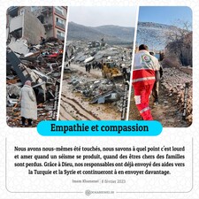Nous avons nous-mêmes été touchés, nous savons à quel point c'est lourd et amer quand un séisme se produit, quand des êtres chers des familles sont perdus. Grâce à Dieu, nos responsables ont déjà envoyé des aides vers la Turquie et la Syrie et continueront à en envoyer davantage. Imam Khamenei, 8 février 2023