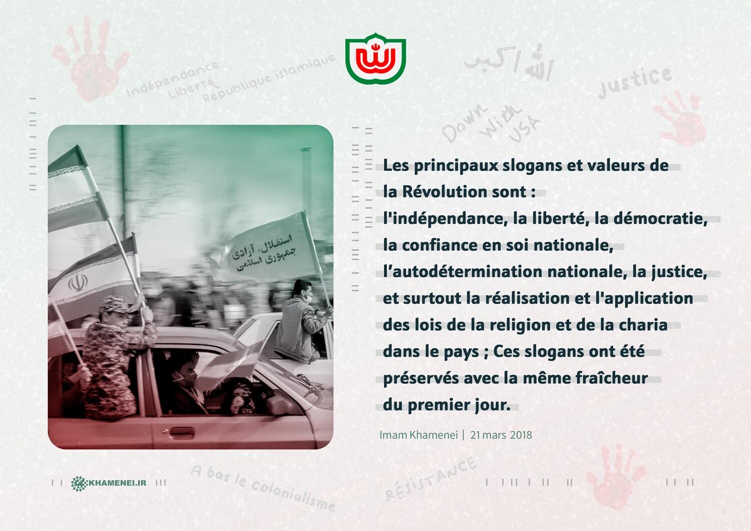 Les principaux slogans et valeurs de la Révolution sont : l'indépendance, la liberté, la démocratie, la confiance en soi nationale, l’autodétermination nationale, la justice, et surtout la réalisation et l'application des lois de la religion et de la charia dans le pays ; Ces slogans ont été préservés avec la même fraîcheur du premier jour. 21 mars 2018