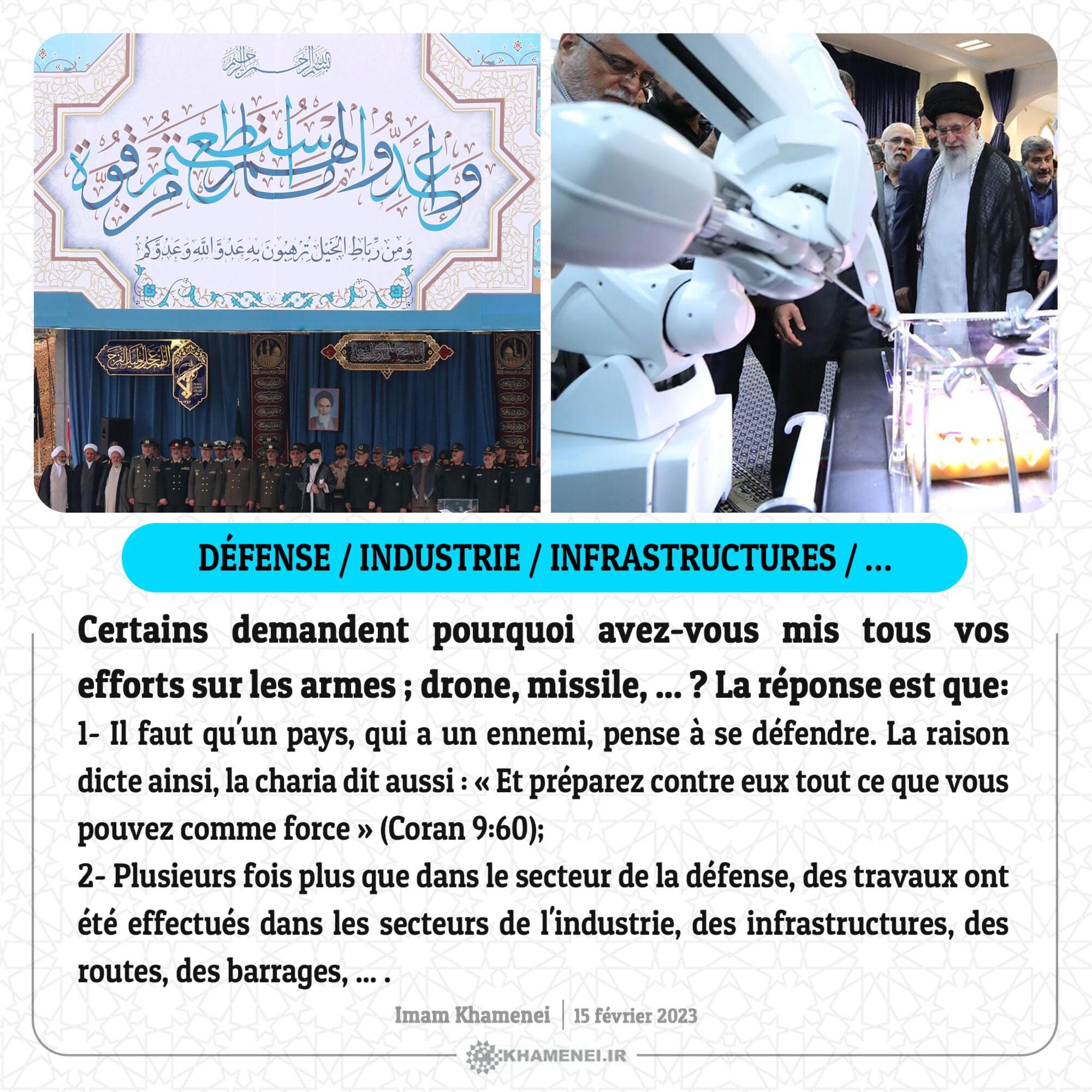 Certains demandent pourquoi avez-vous mis tous vos efforts sur les armes ; drone, missile, ... ? La réponse est que : 1- Il faut qu'un pays, qui a un ennemi, pense à se défendre. La raison dicte ainsi, la charia dit aussi : « Et préparez contre eux tout ce que vous pouvez comme force » (Coran 9:60); 2- Plusieurs fois plus que dans le secteur de la défense, des travaux ont été effectués dans les secteurs de l'industrie, des infrastructures, des routes, des barrages, ... . Imam Khamenei, 15 février 2023