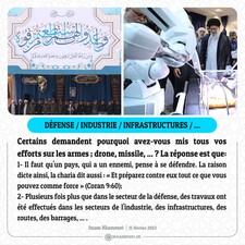 Certains demandent pourquoi avez-vous mis tous vos efforts sur les armes ; drone, missile, ... ? La réponse est que : 1- Il faut qu'un pays, qui a un ennemi, pense à se défendre. La raison dicte ainsi, la charia dit aussi : « Et préparez contre eux tout ce que vous pouvez comme force » (Coran 9:60); 2- Plusieurs fois plus que dans le secteur de la défense, des travaux ont été effectués dans les secteurs de l'industrie, des infrastructures, des routes, des barrages, ... . Imam Khamenei, 15 février 2023
