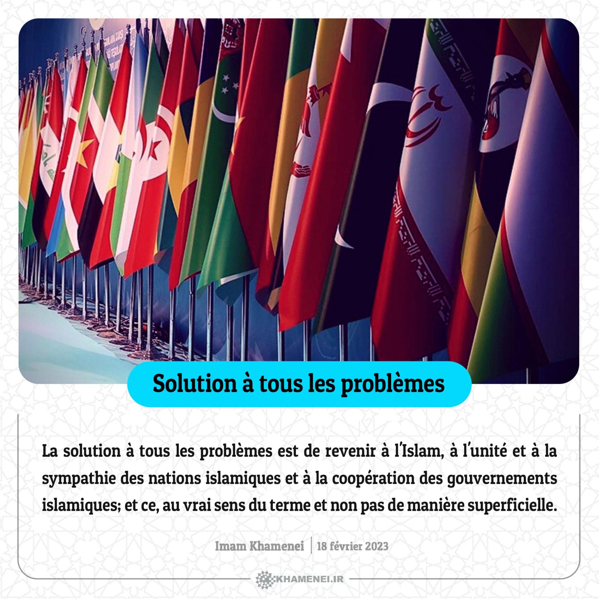 La solution à tous les problèmes est de revenir à l'Islam, à l'unité et à la sympathie des nations islamiques et à la coopération des gouvernements islamiques; et ce, au vrai sens du terme et non pas de manière superficielle. Imam Khamenei, 18 février 2023
