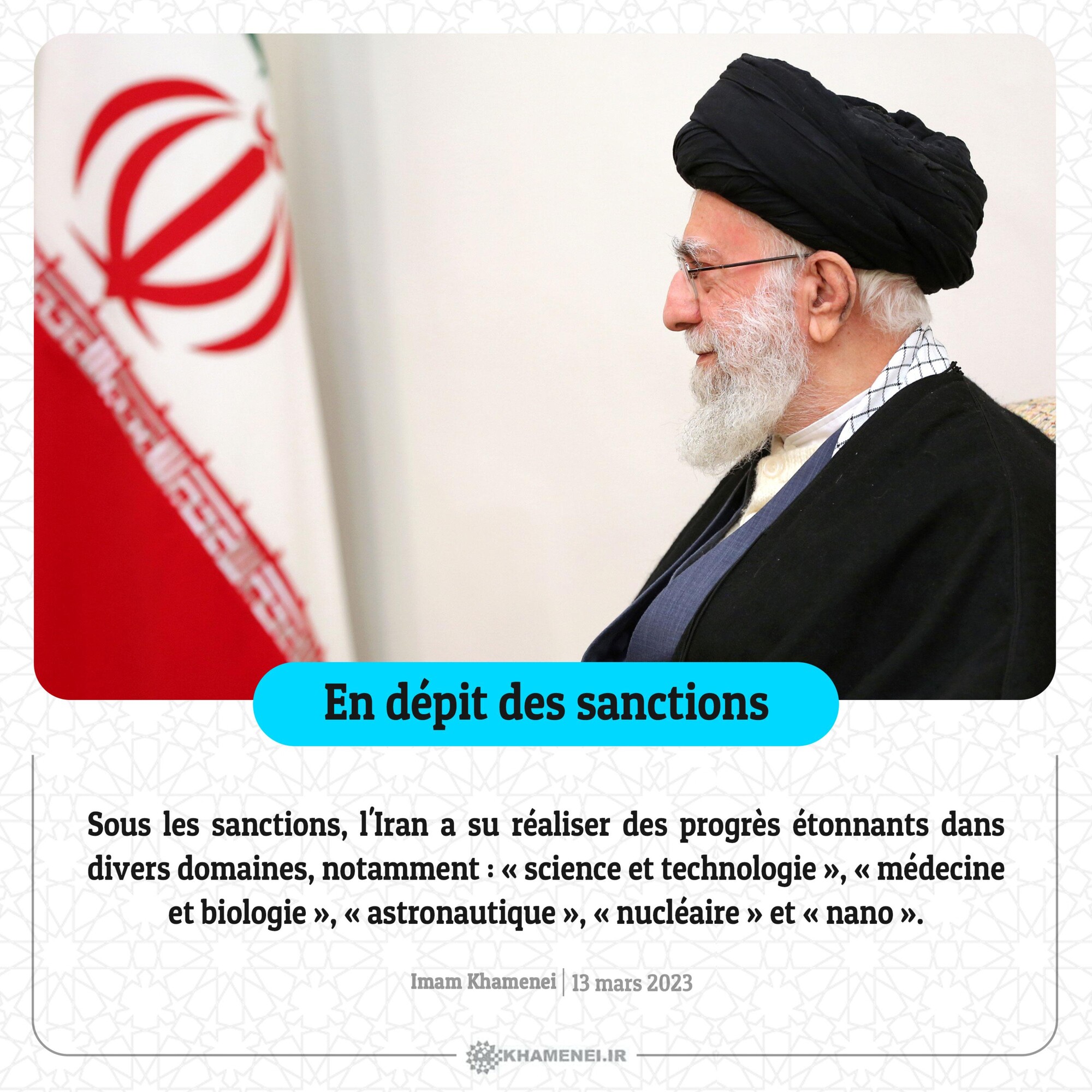 Sous les sanctions, l'Iran a su réaliser des progrès étonnants dans divers domaines, notamment : « science et technologie », « médecine et biologie », « astronautique », « nucléaire » et « nano ». Imam Khamenei, 13 mars 2023