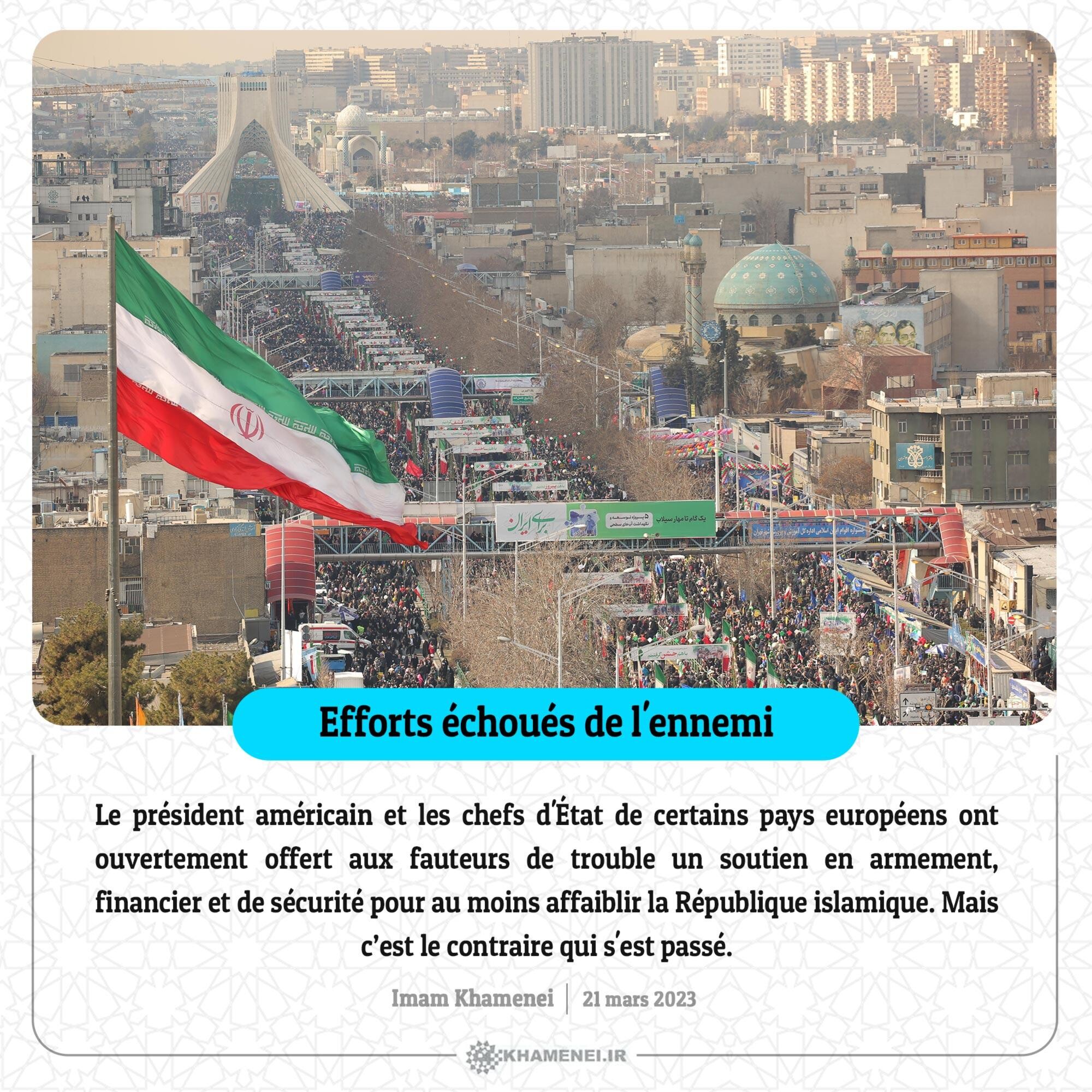 Le président américain et les chefs d'État de certains pays européens ont ouvertement offert aux fauteurs de trouble un soutien en armement, financier et de sécurité pour au moins affaiblir la République islamique. Mais c’est le contraire qui s'est passé. Imam Khamenei, 21 mars 2023