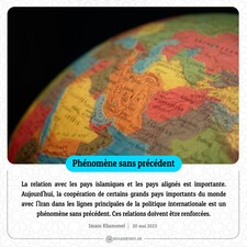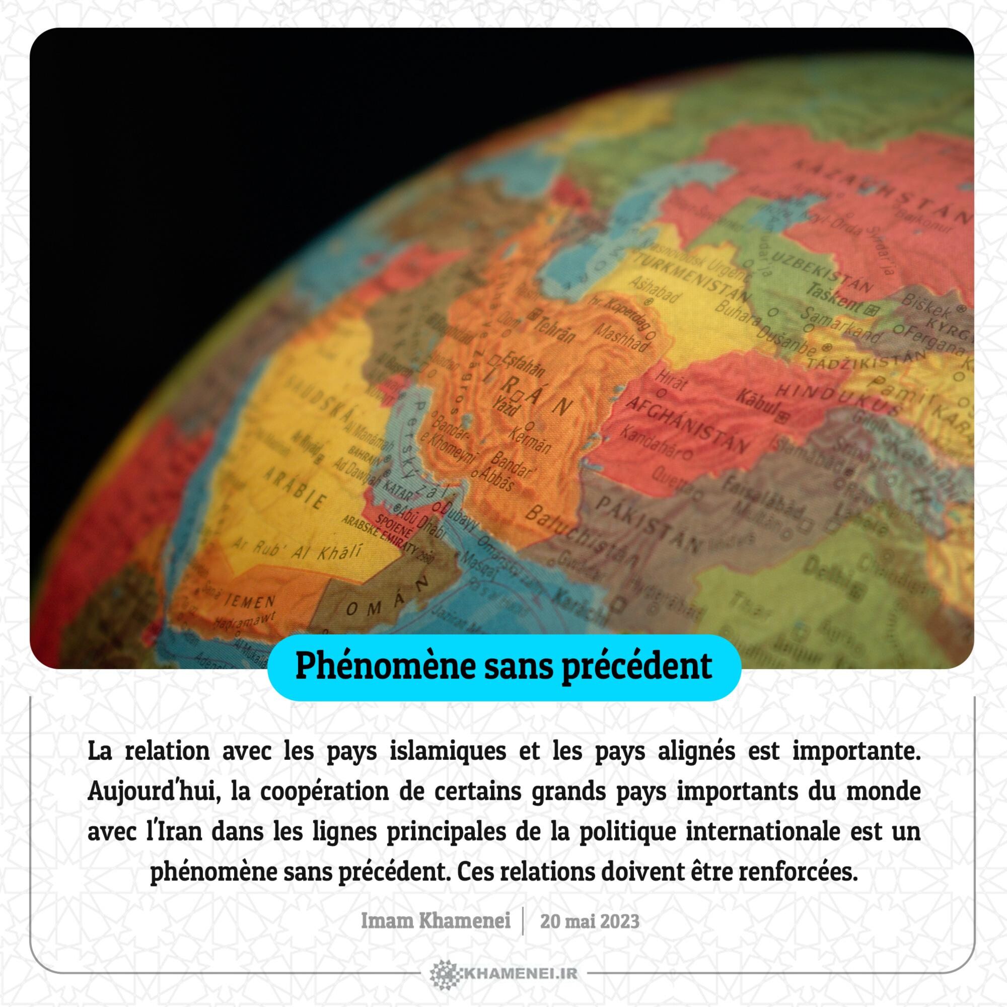 La relation avec les pays islamiques et les pays alignés est importante. Aujourd'hui, la coopération de certains grands pays importants du monde avec l'Iran dans les lignes principales de la politique internationale est un phénomène sans précédent. Ces relations doivent être renforcées. 20 mai 2023